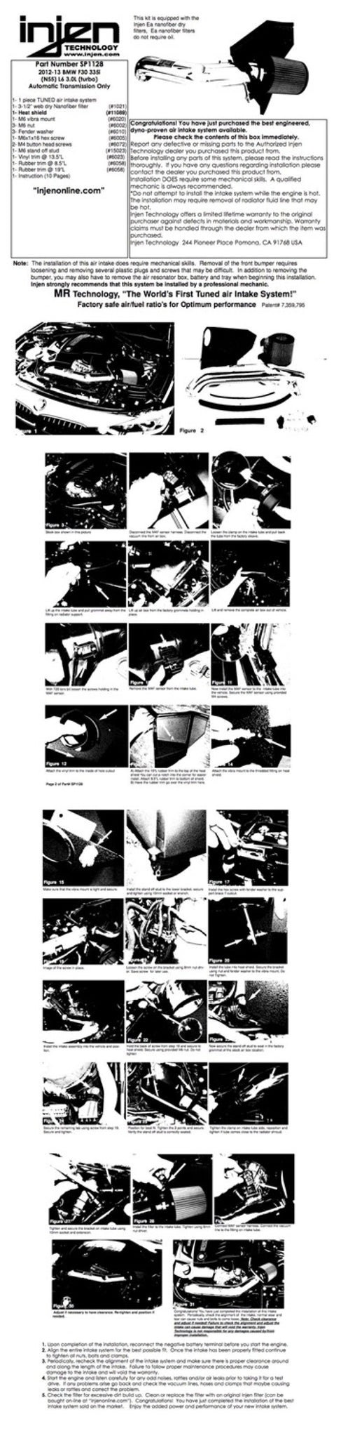 Is your engine choking for air and in need of some additional horsepower? If so, Injen has exciting news for you! The SP series of cold air intakes from Injen Technology will allow your engine to breathe deeper and enhance the performance that you've been craving. The SP series of cold air intakes is Injen's flagship system in their lines of traditional aluminum cold air intake systems. Injen Technology is the world's first tuned air intake system and holds four (4) patents on the tuning process of an intake system ? something no other manufacturer can claim. The SP series of cold air intakes feature many of Injen Technology's patented tuning process, including MegaRam (MR) Technology (Patents 7,359,795 and 7,669,571), Air Fusion (Patents 7,757,548 and 7,721,699), and many other innovations that keep Injen Technology at the forefront in the performance aftermarket. , , The soul of this intake is found within 6061-T6 aluminum air intake tube that provides a smooth uninterrupted path for highly efficient airflow. Our engineers have painstakingly designed the intake to provide the highest levels of safe power, along with clean aesthetics that will impress every time you open your hood. In addition to the impressive power increase, the Injen team has ensured that a safe Air fuel (A/F) ratio has been maintained throughout the power band. , , Additionally, this SP intake includes a fully serviceable Injen SuperNano-Web dry air filter, which provides increased filter surface area allowing for greater airflow and unbeatable filtration. If that's not enough, the Injen SP performance intake provides power you can hear and feel! This intake provides an aggressive and throaty tone that is unmatched in the aftermarket. Want to add that personalized touch to your intake? You're in luck, as Injen also offers this intake system in multiple finishes. To top it all off, this SP CAI kit includes the unbeatable Injen Technology limited Lifetime Warranty!