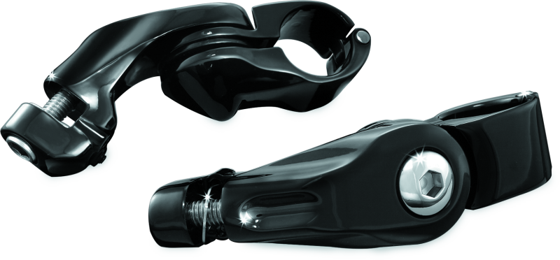 These cruise mounts with positive locking Quick Clamps offer an incredible range of adjustability. The entire assembly may be moved up or down on the engine guard. The arm and footpeg may be further adjusted along a vertical or horizontal arc. A unique clevis permits angle adjustment of the footpeg. The heavy-duty Quick Clamp and sturdy offset arm ensures that the footpegs will clear fairing lowers and will stay where you put them.