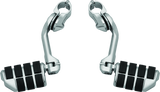 These cruise mounts with positive locking Quick Clamps offer an incredible range of adjustability. The entire assembly may be moved up or down on the engine guard. The arm and footpeg may be further adjusted along a vertical or horizontal arc. A unique clevis permits angle adjustment of the footpeg. The heavy-duty Quick Clamp and sturdy offset arm ensures that the footpegs will clear fairing lowers and will stay where you put them.